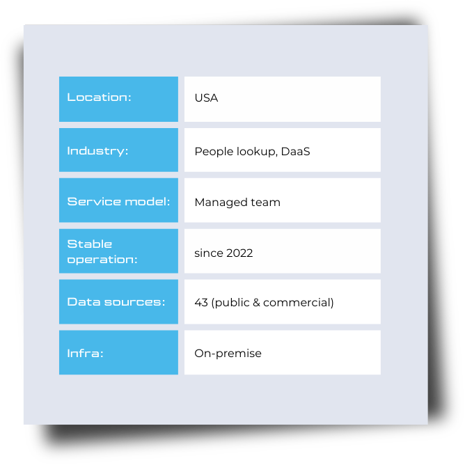 The client is a public records provider for consumers & businesses seeking details on people in the US. Their business depends on regular data updates from 43 public and commercial data providers.
